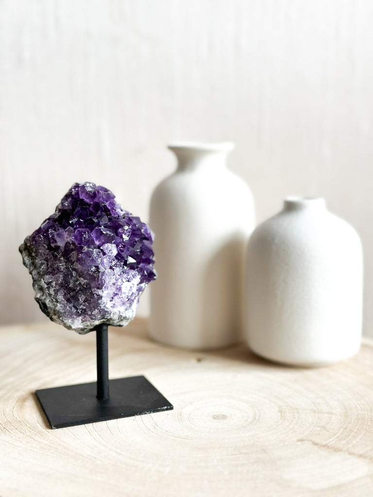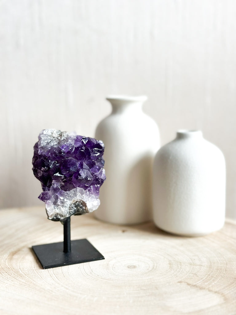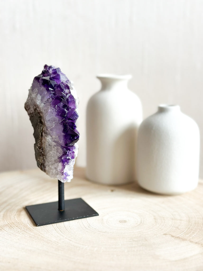 Cette géode d'améthyste sur socle est un excellent ajout à toute collection. La beauté naturelle de l'améthyste pratiquement indestructible est caractérisée par des cristaux striés vibrants. Son apparence unique met en valeur l'énergie naturelle et les propriétés de guérison de l'améthyste, en faisant un objet de décoration fonctionnel et élégant.