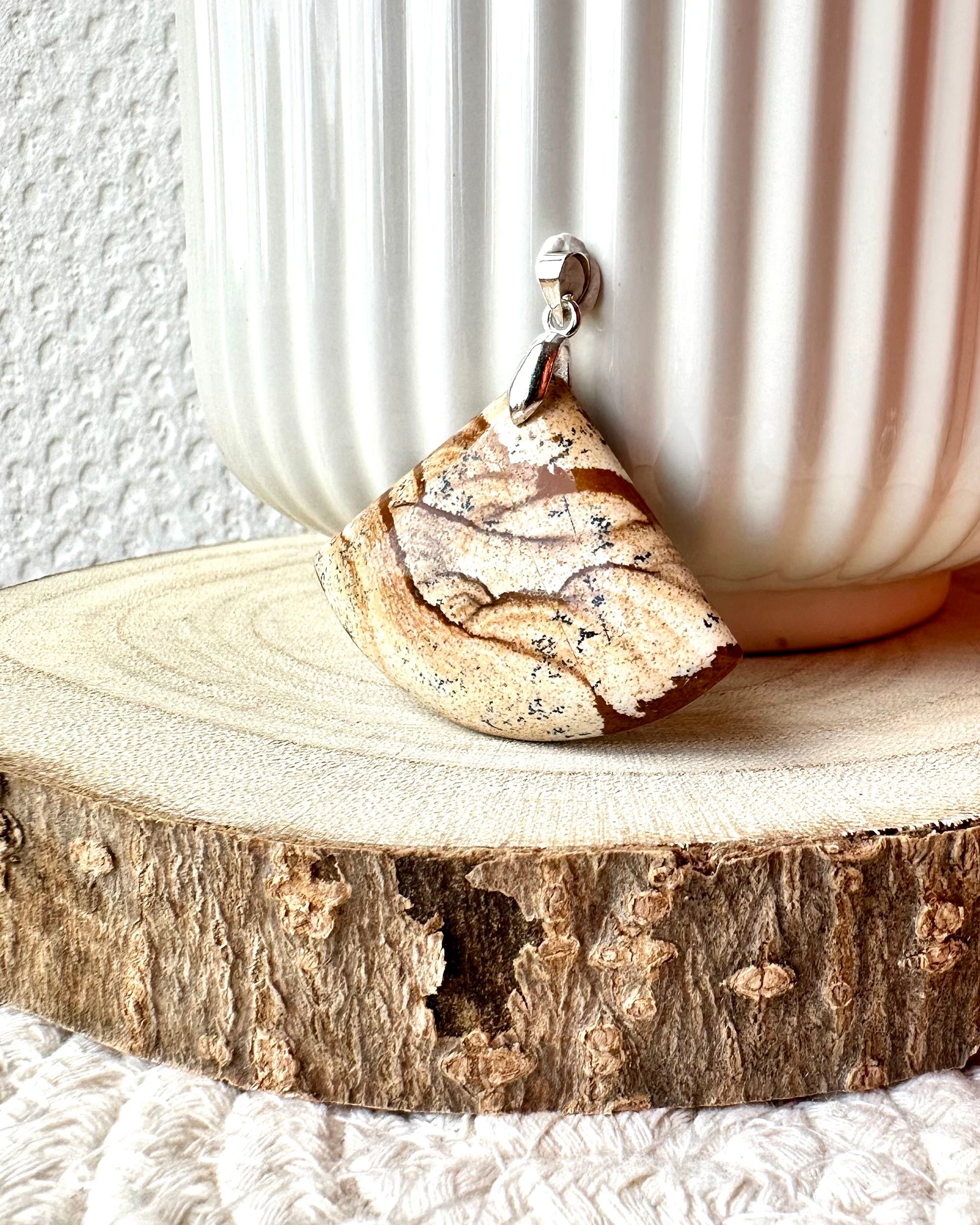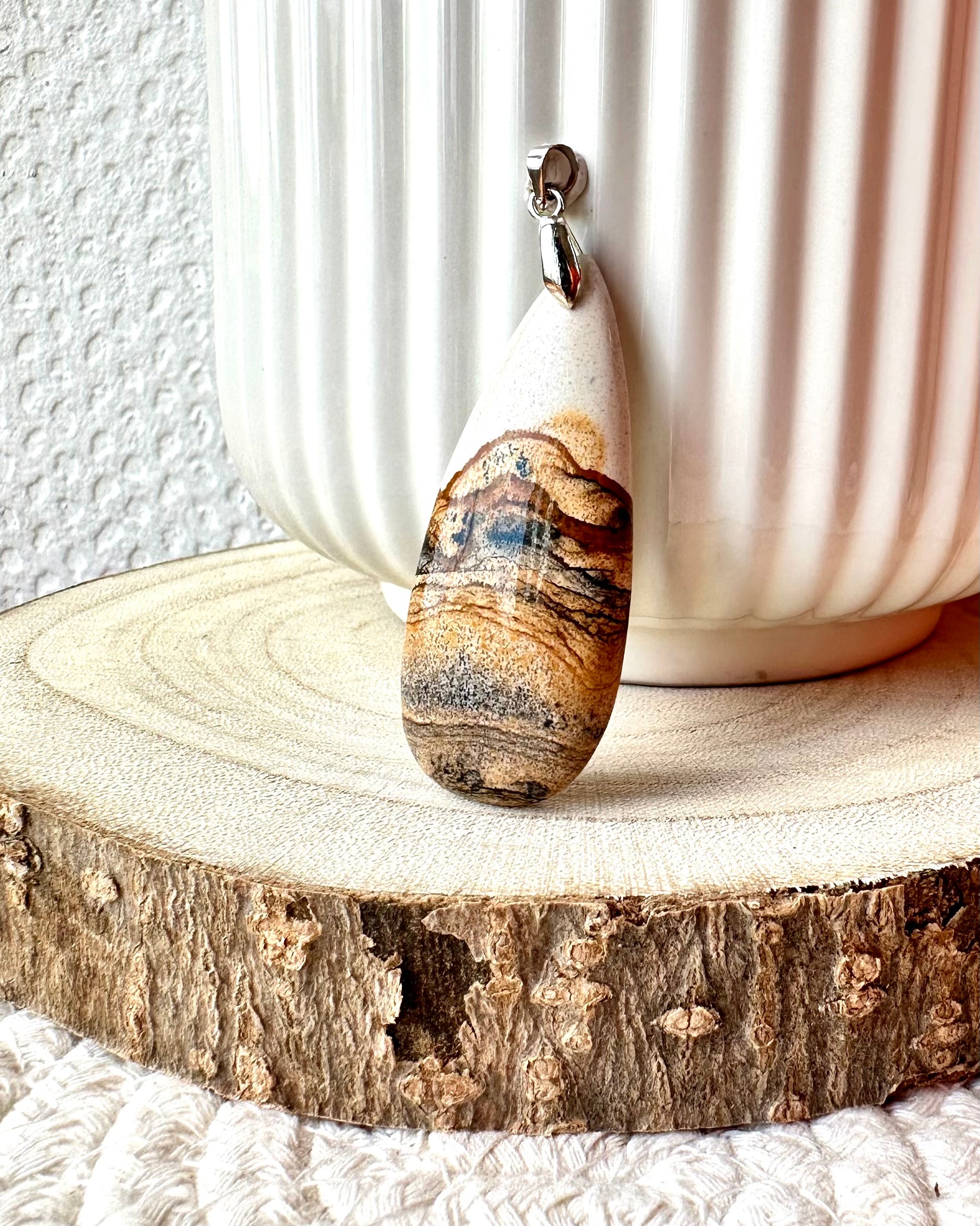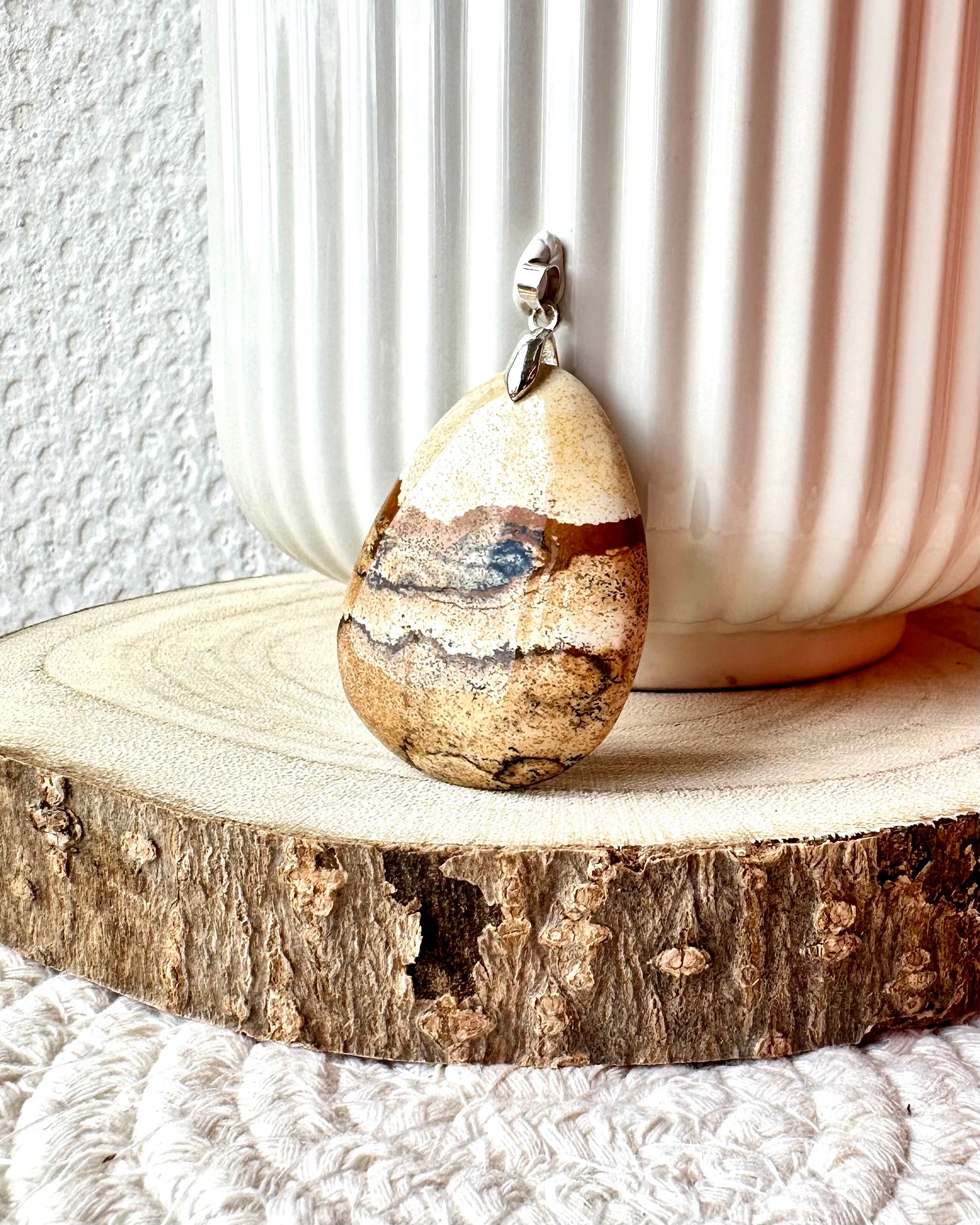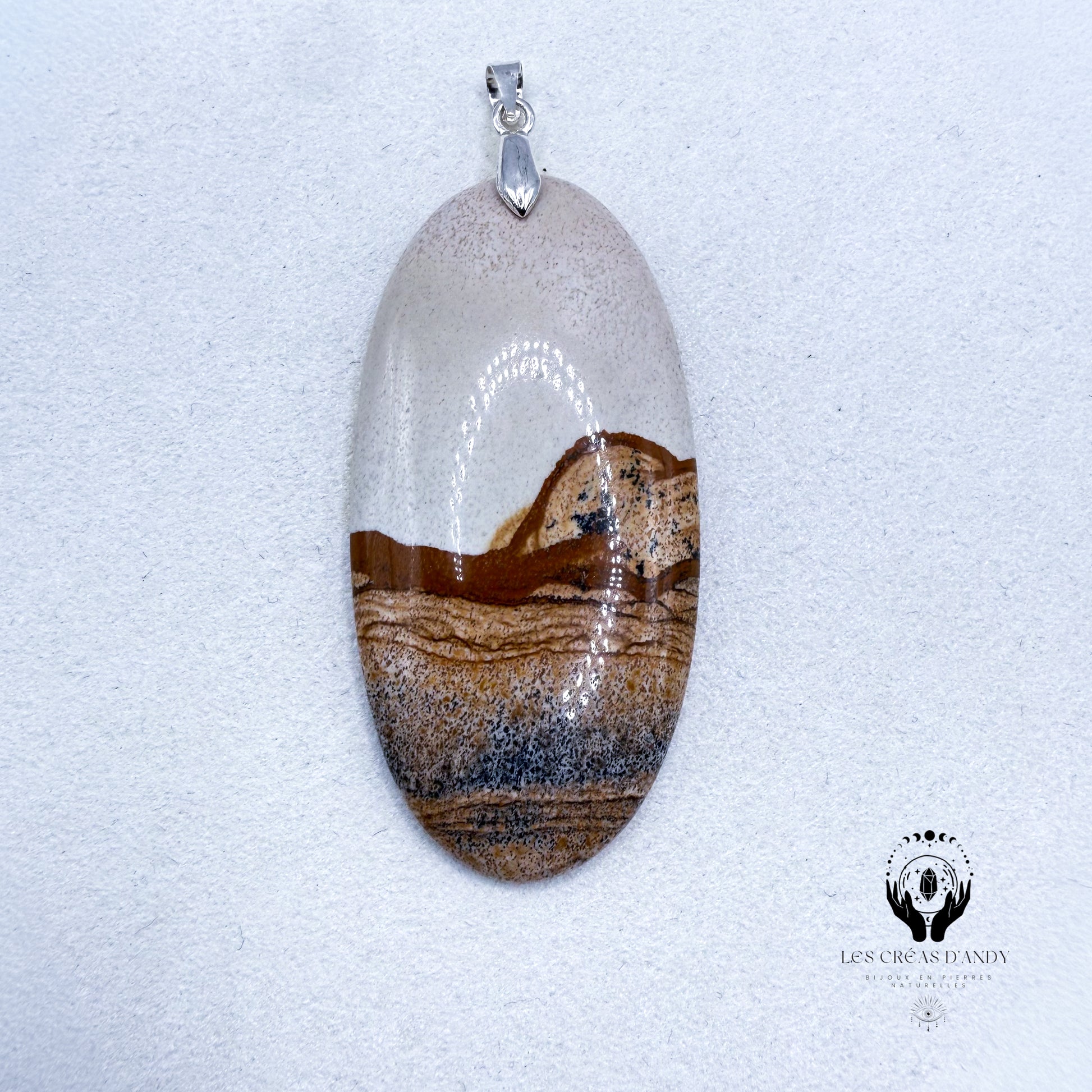 Pendentifs en pierres naturelles Jaspe paysage et bélière acier inoxydable.