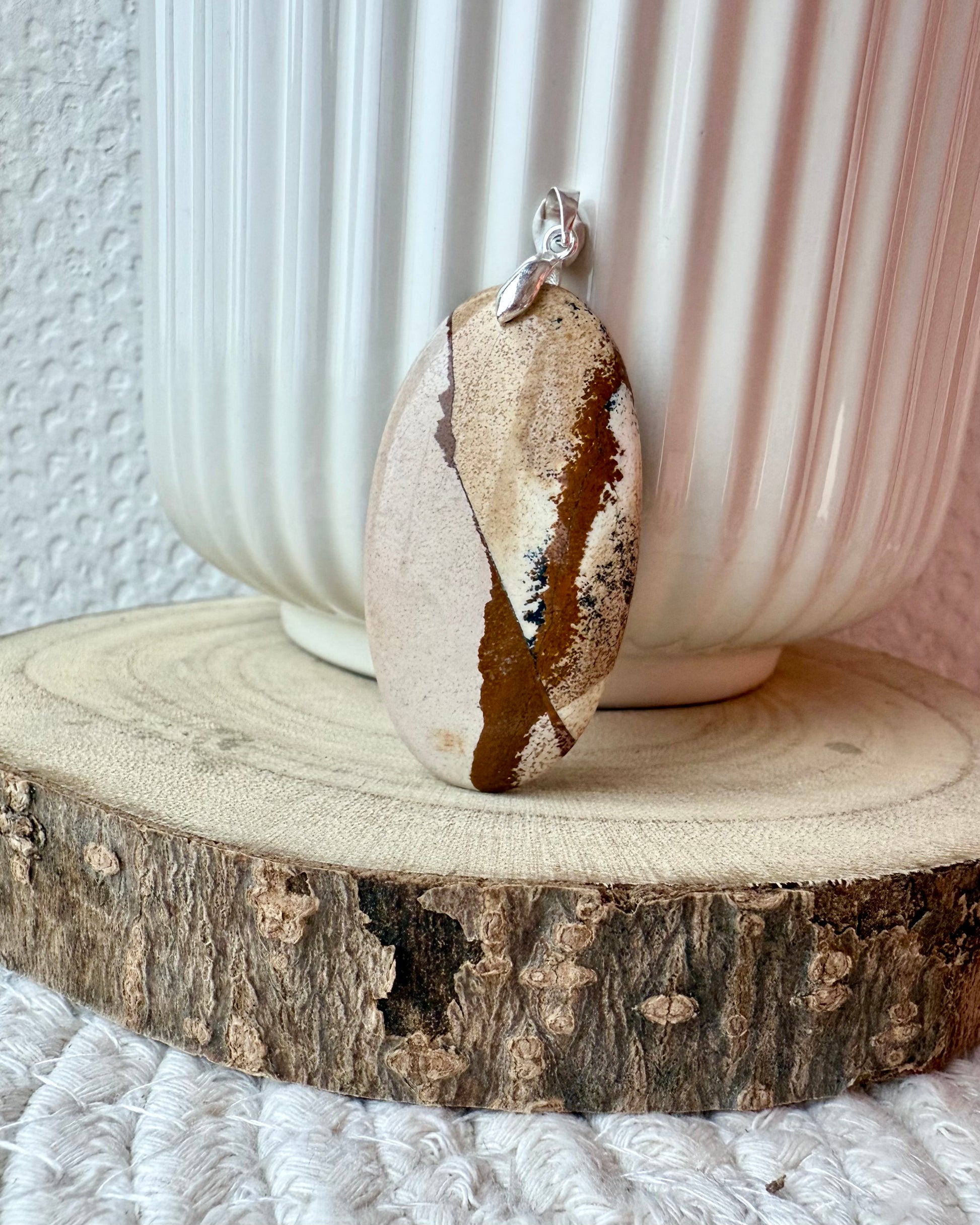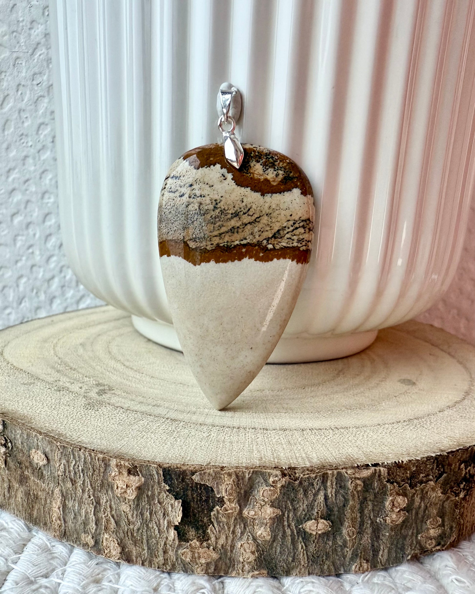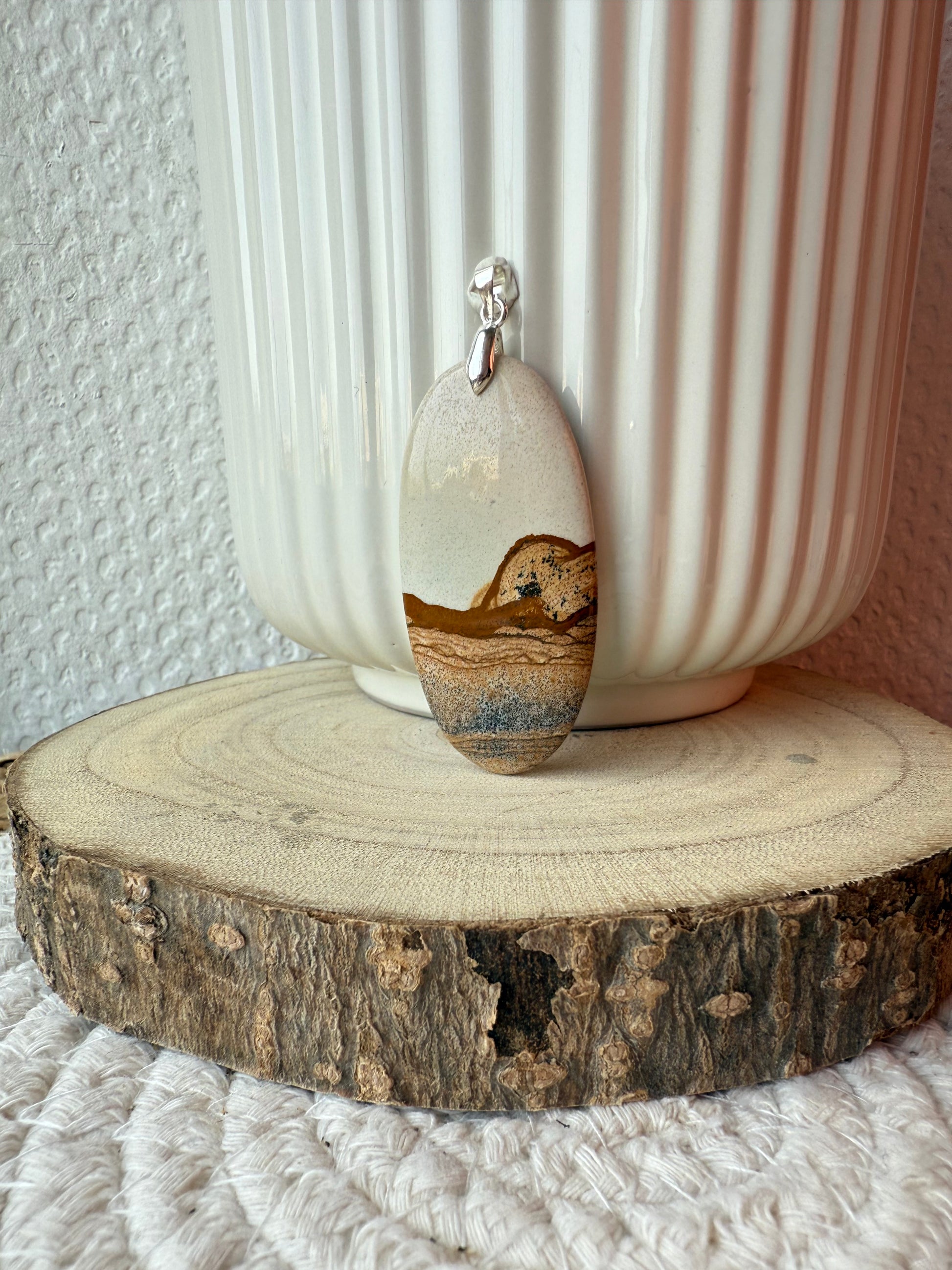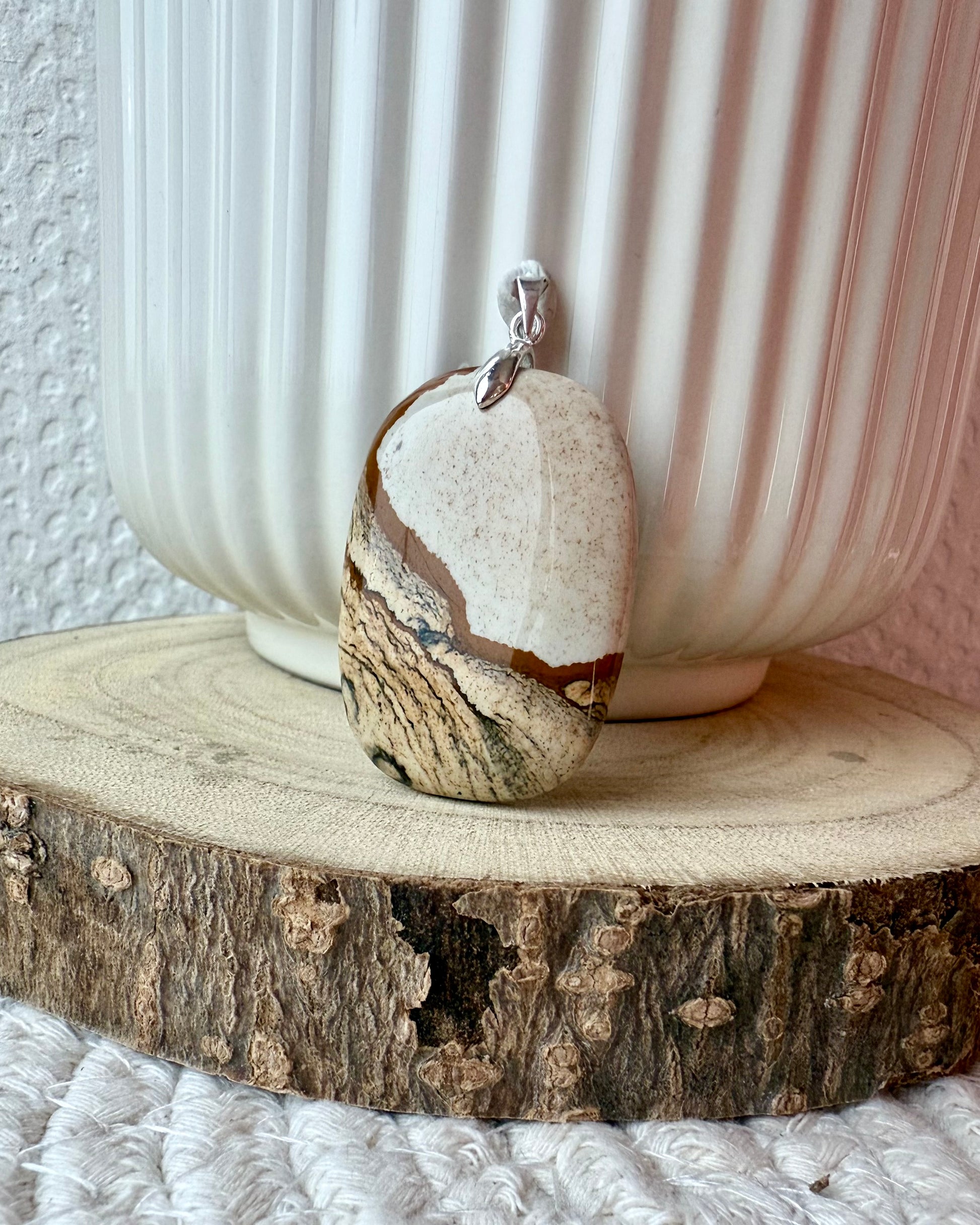 Pendentifs en pierres naturelles Jaspe paysage et bélière acier inoxydable.