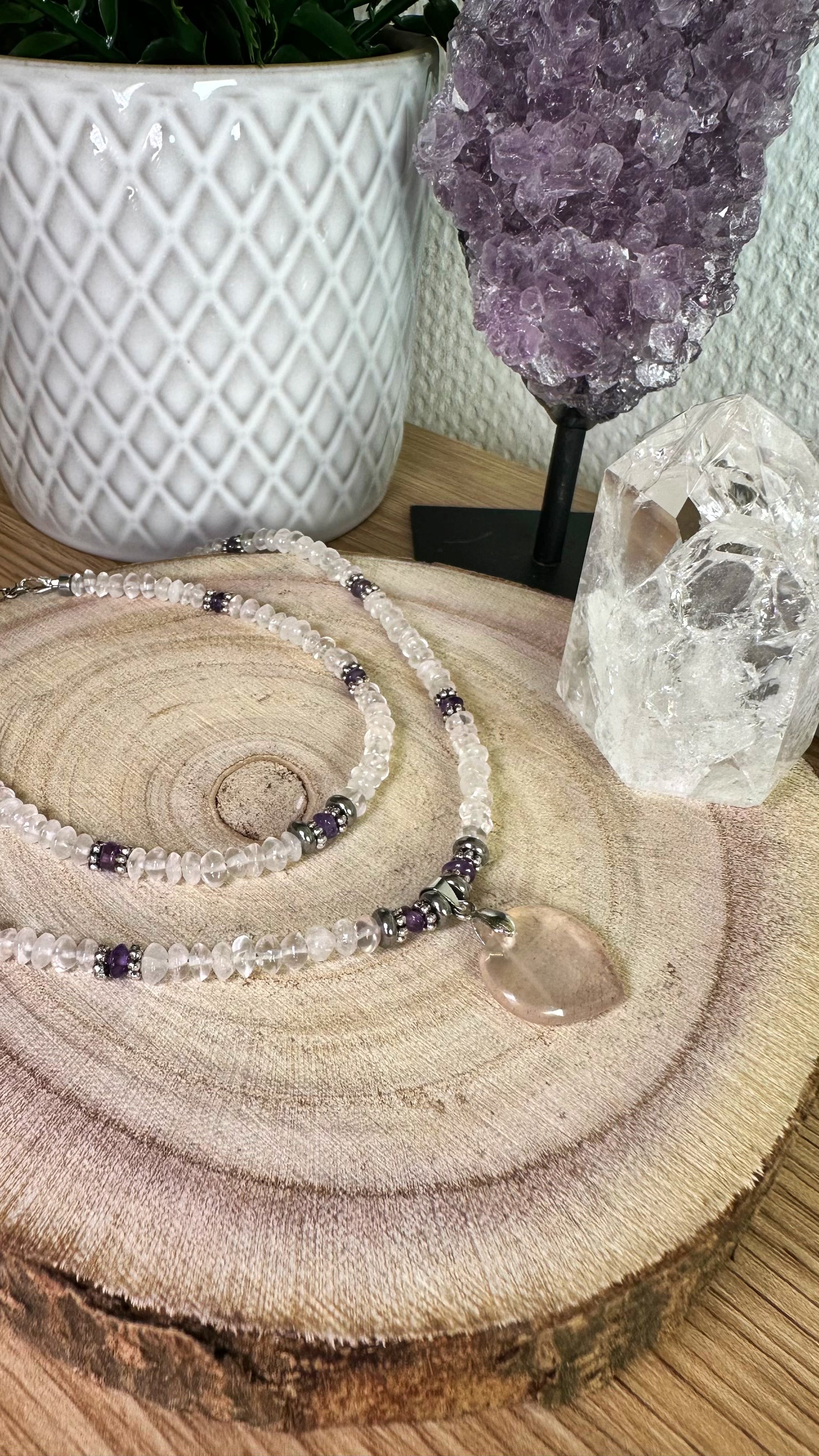 Duo collier ras de cou Coeur en Quartz rose et perles naturelles Quartz rose et Amethyste et son bracelet en perles naturelles Quartz rose et Amethyste.