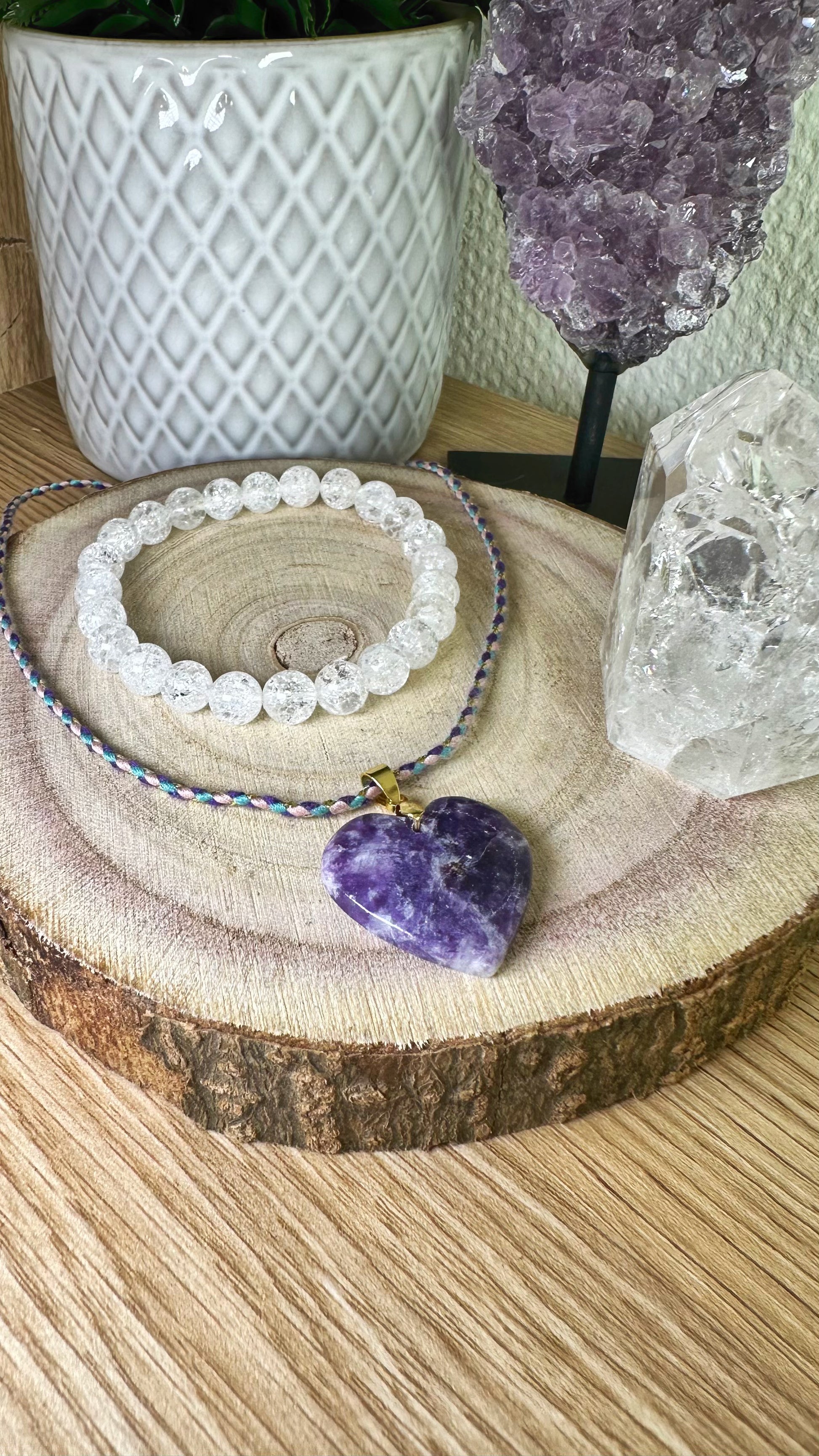 Duo collier coeur en Lépidolite et cordon tressé avec son bracelet en Cristal de roche