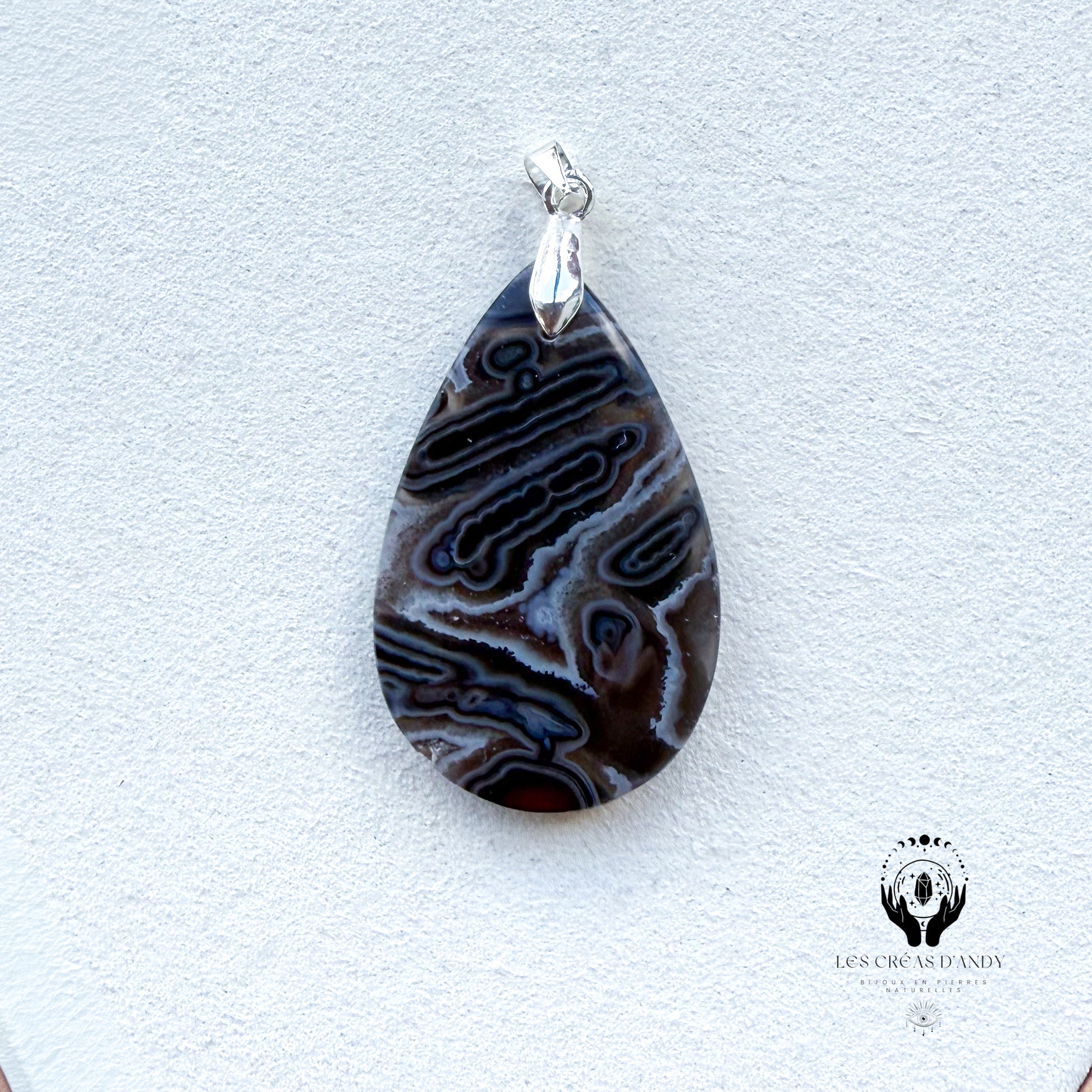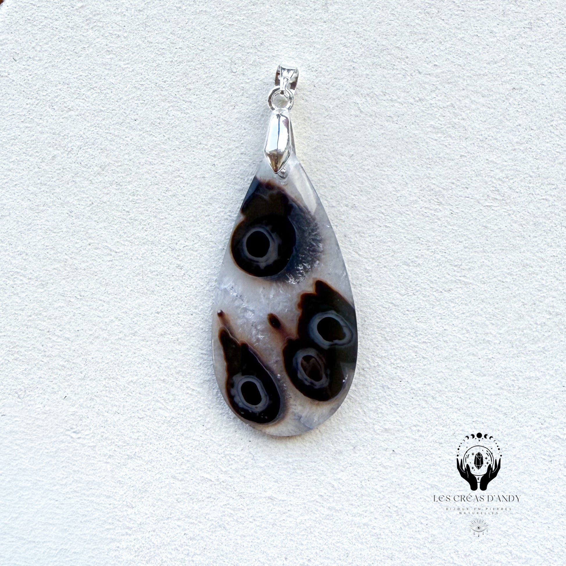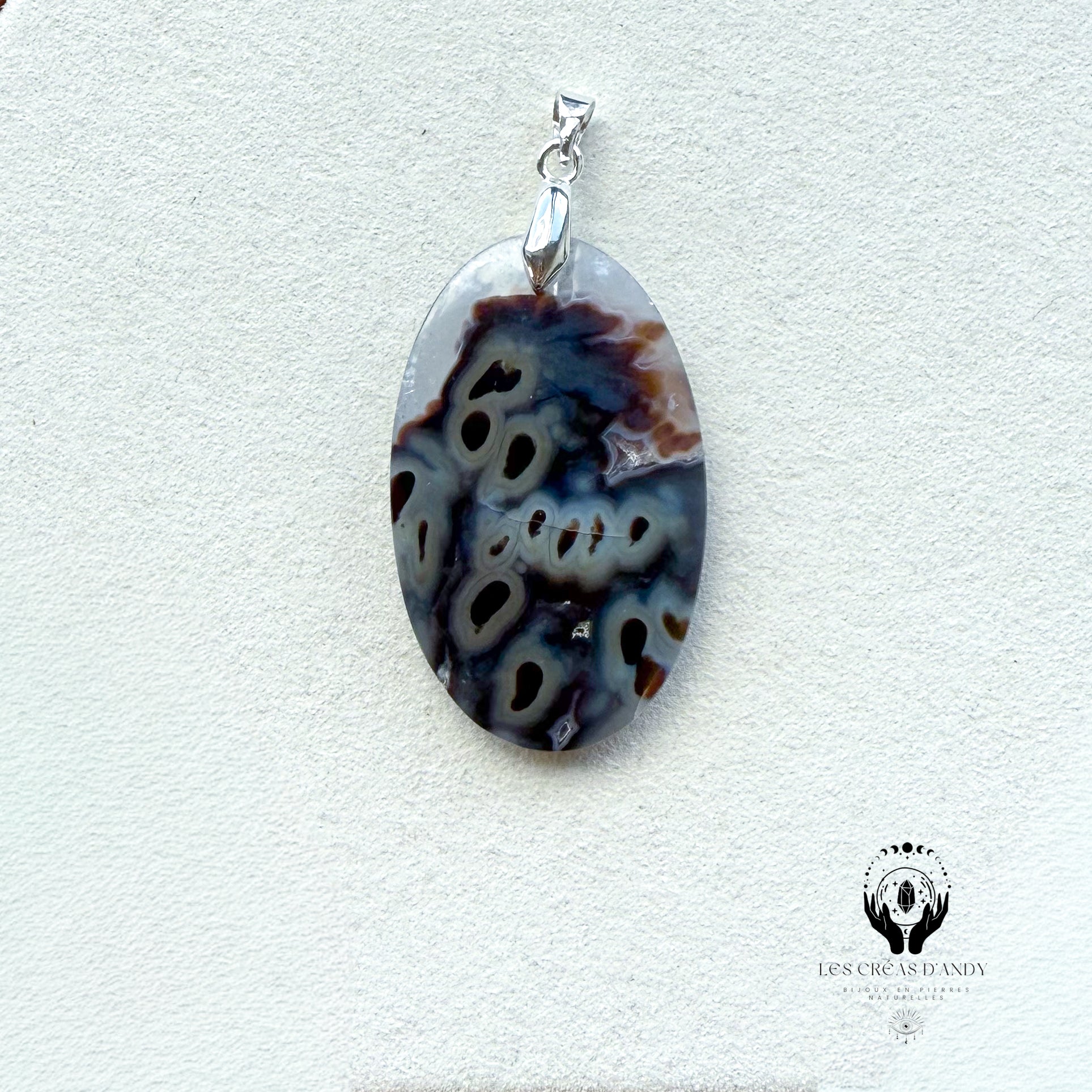 Pendentif en pierres naturelles Agate noir orbiculaire et bélière acier inoxydable