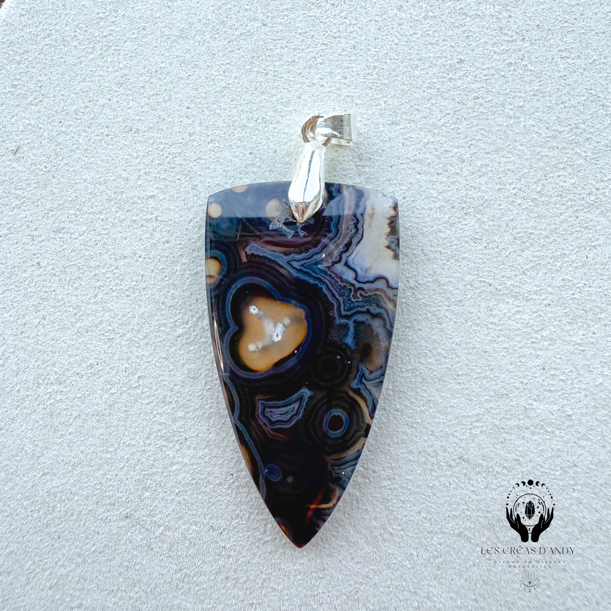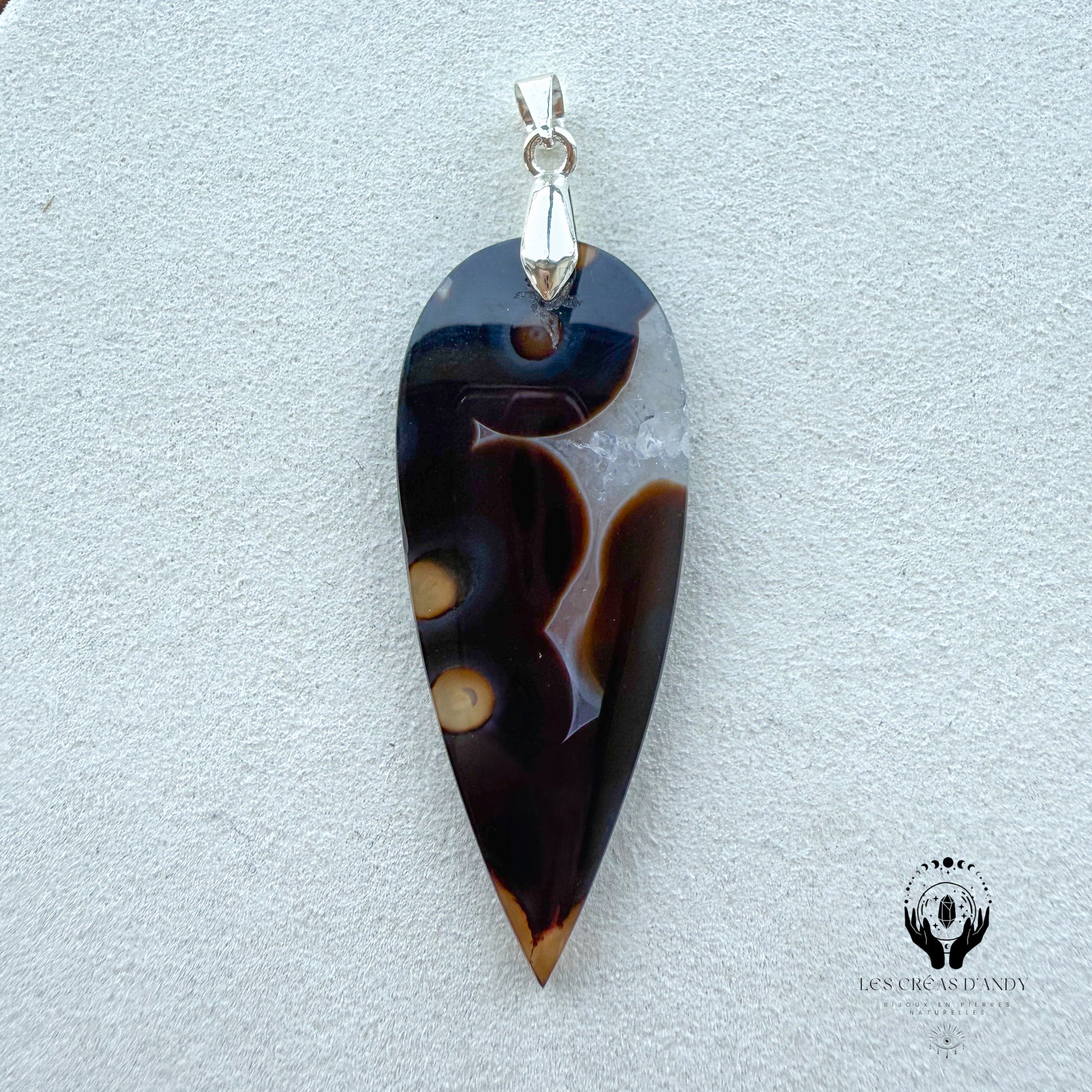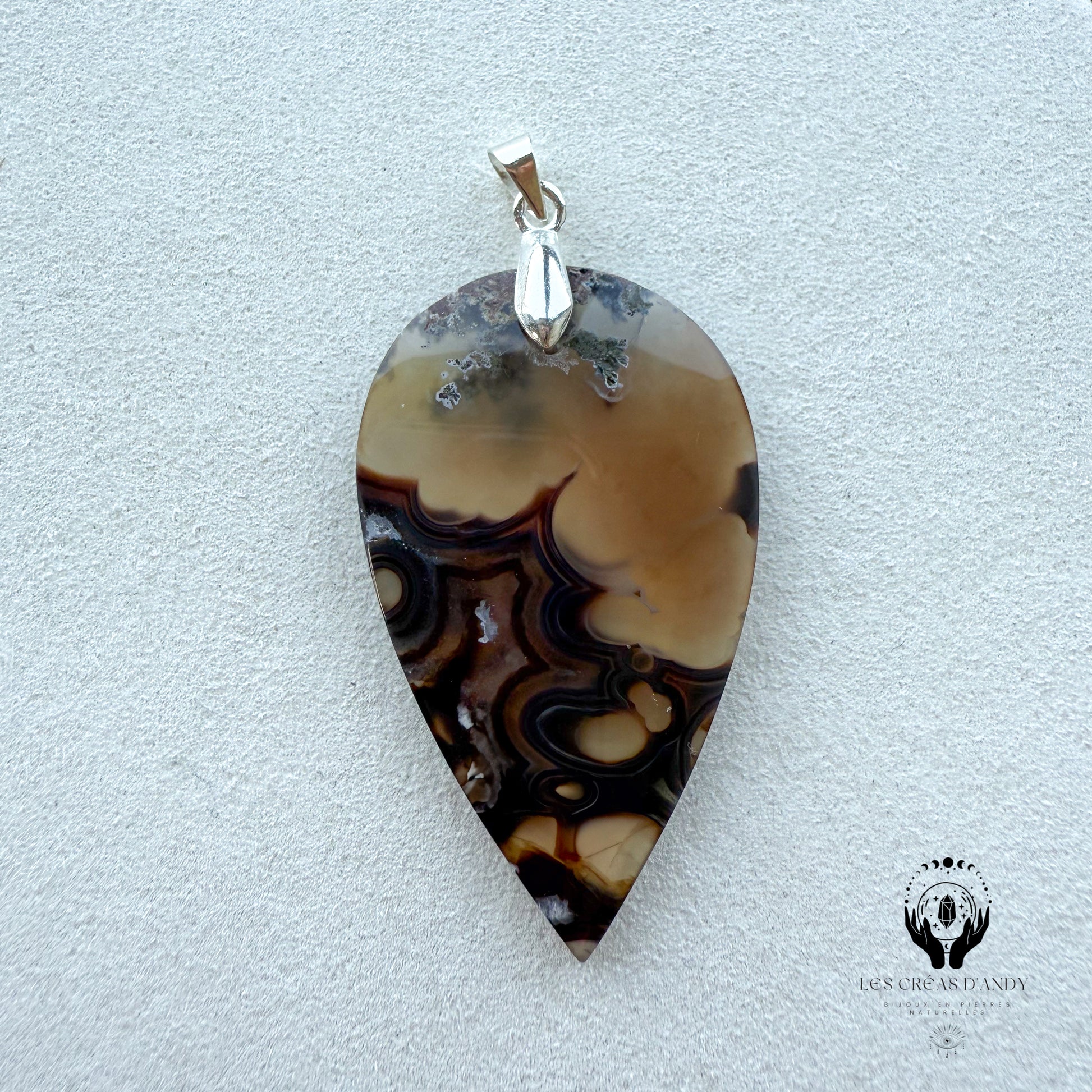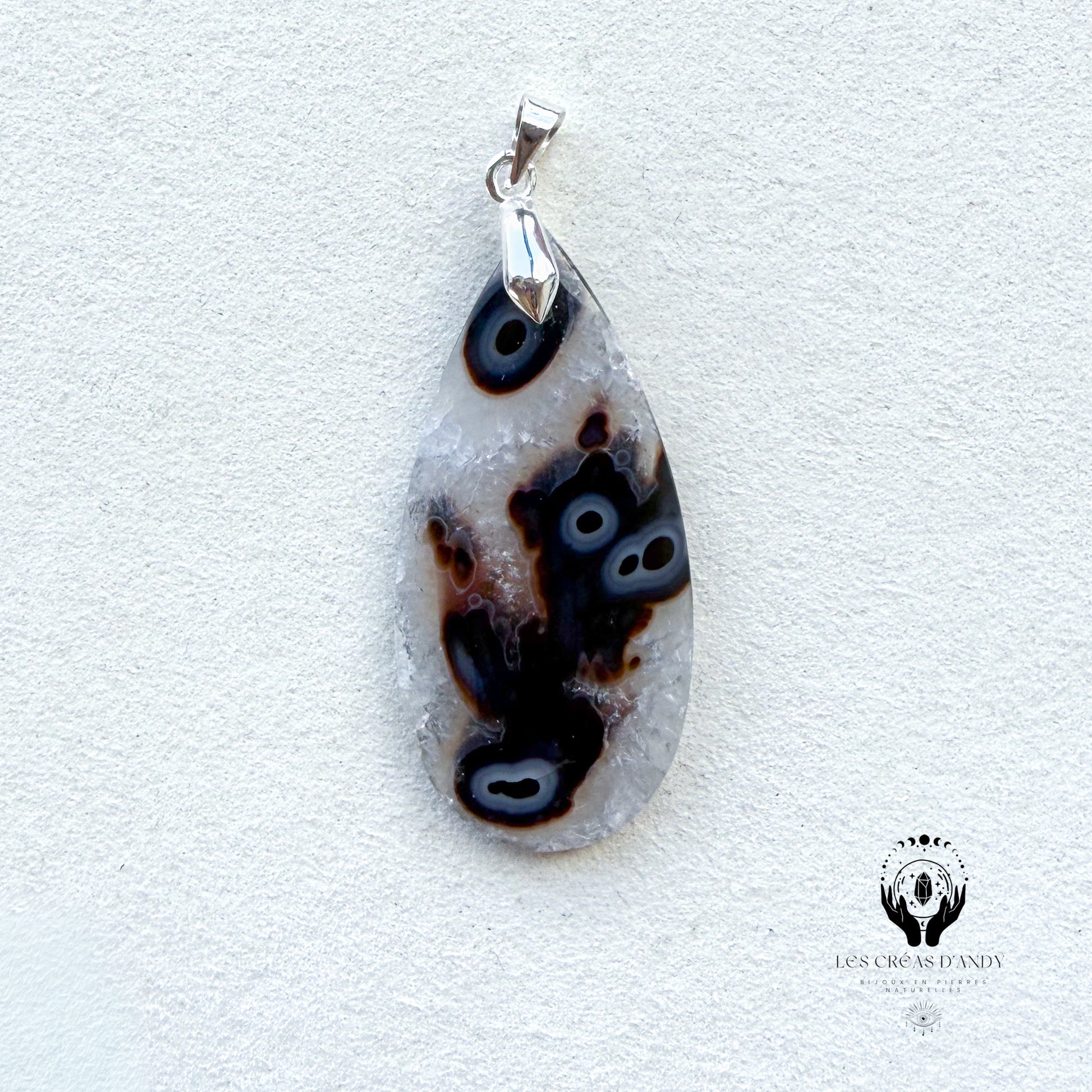 Pendentif en pierres naturelles Agate noir orbiculaire et bélière acier inoxydable