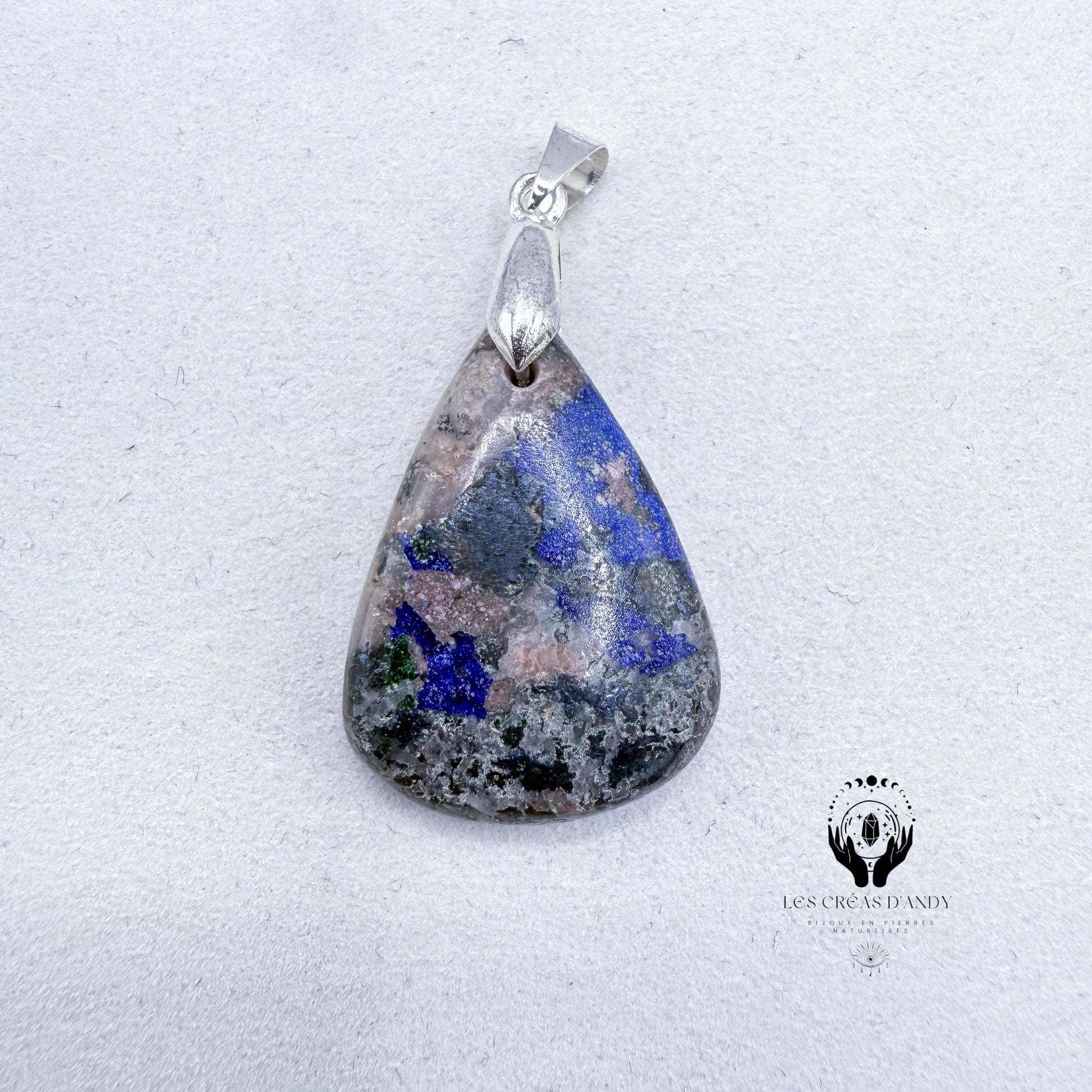 Pendentifs en pierres naturelles Azurite-cobaltocalcite et bélière acier inoxydable.