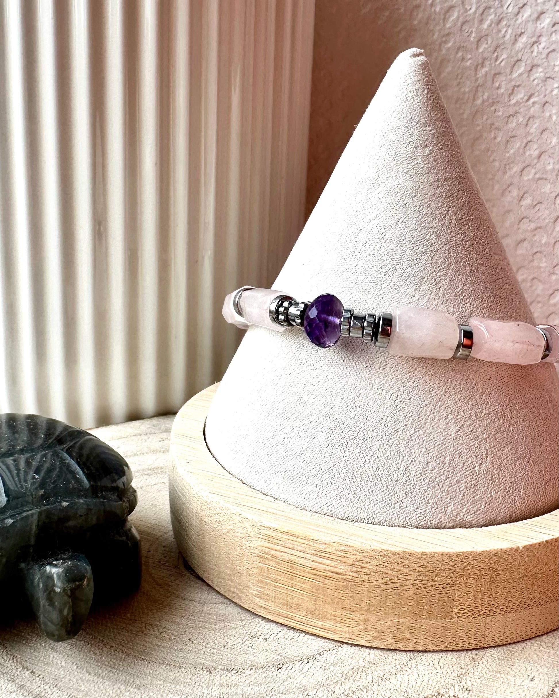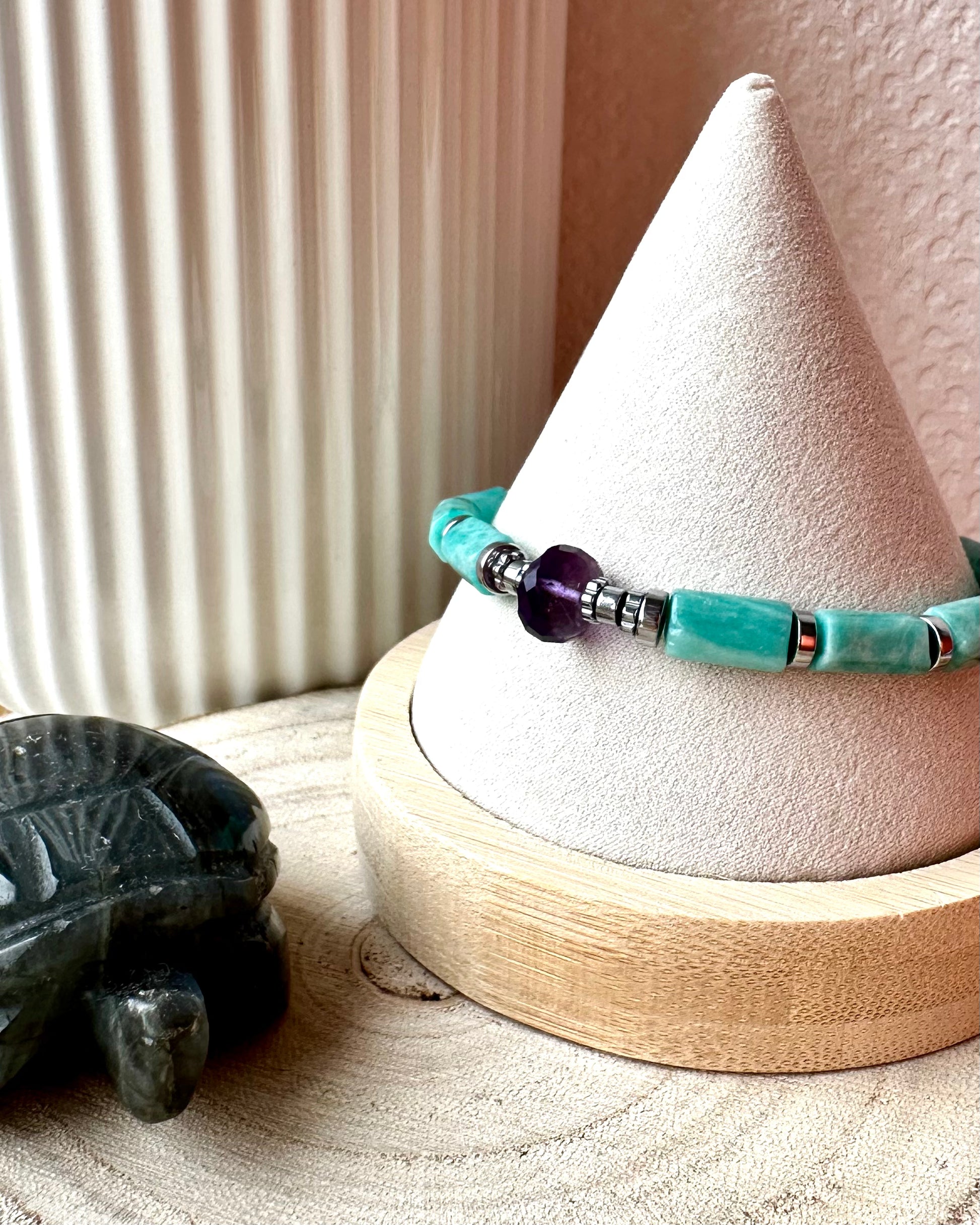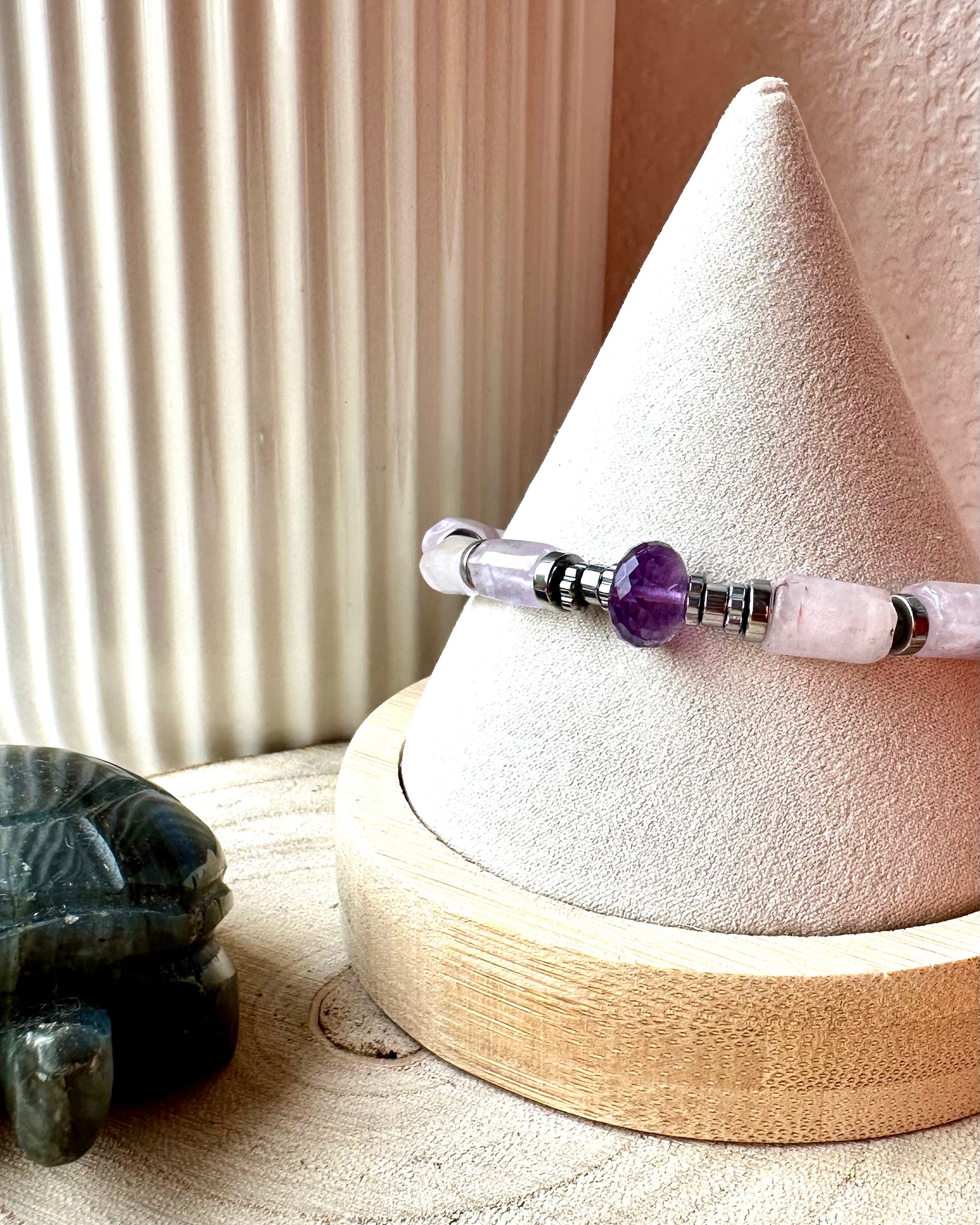 -Bracelet fait main en perles naturelles et hématite, perle centrale en Améthyste facetté