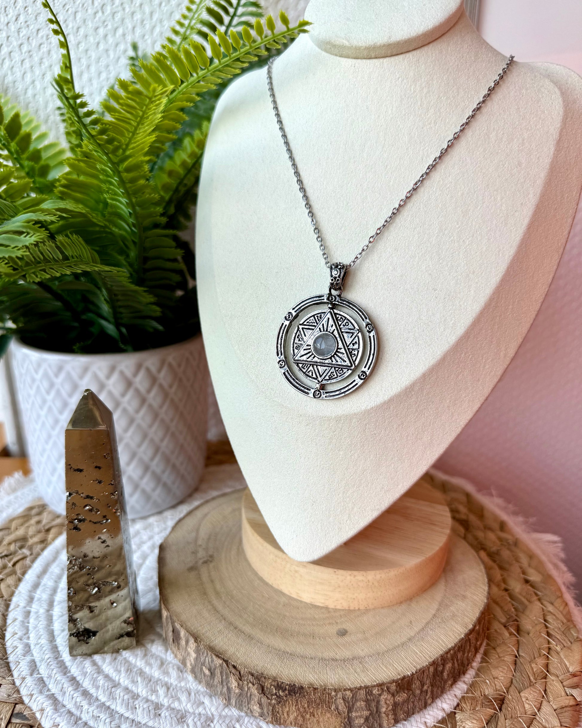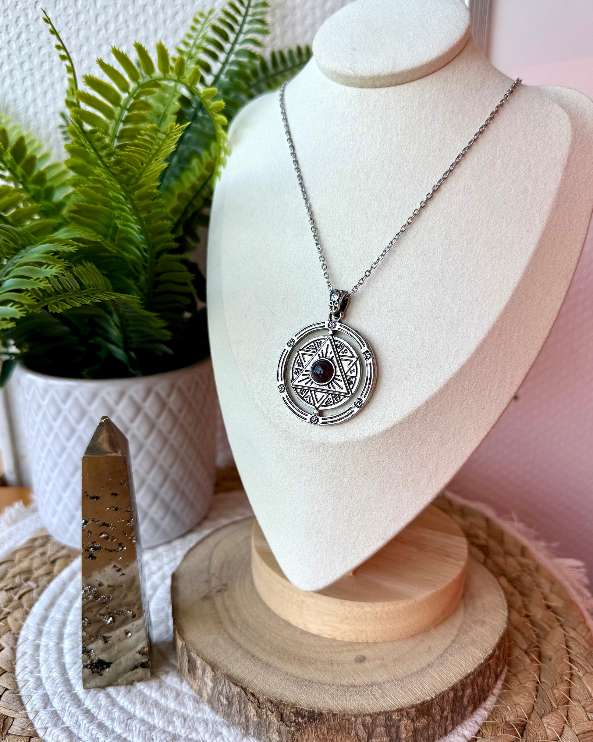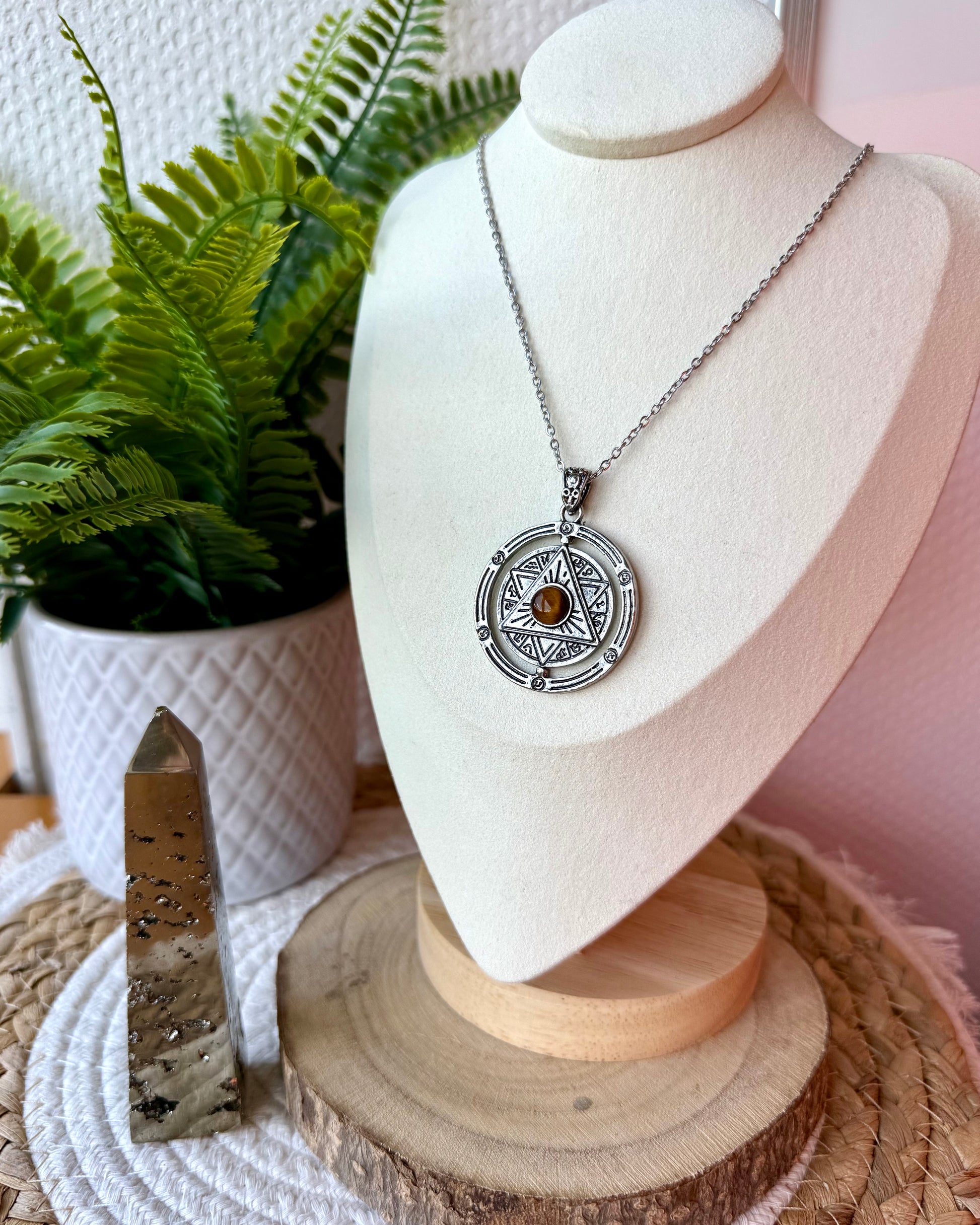 Collection masculine alliant puissance brute et spiritualité : colliers en pierres naturelles et symboles de géométrie sacrée, montés sur acier inoxydable pour un style intemporel et énergétique.