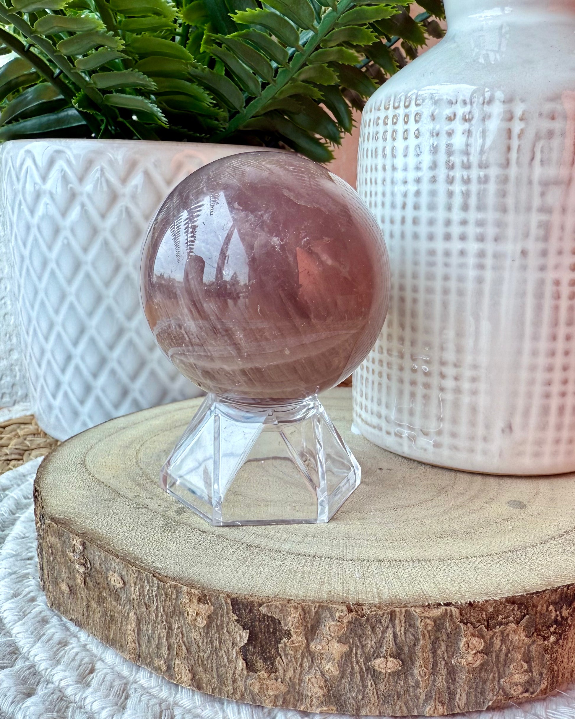 Le quartz rose en forme de sphère est une pierre délicate et apaisante. Avec sa couleur rose douce et sa forme ronde, elle possède des propriétés calmantes pour l'esprit et le corps. Utilisé en méditation, il peut aider à ouvrir le cœur et à favoriser l'amour inconditionnel.